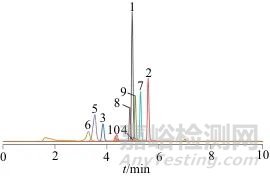1—克百威;2—仲丁威;3—滅多威;4—涕滅威;5—涕滅威砜;6—涕滅威亞砜;7—異丙威;8—速滅威;9—甲萘威;10—3-羥基克百威