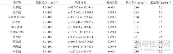 Tab. 3 Linear range,linear equation,correlation coefficient,detection limit and quantitation limit of 10 kinds of carbamate pesticides