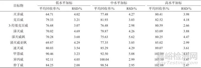 取系列混合標(biāo)準(zhǔn)工作溶液,在1.2儀器工作條件下進(jìn)樣分析,以目標(biāo)組分峰面積(y)為縱坐標(biāo),以待測液農(nóng)藥濃度(x)為橫坐標(biāo),繪制標(biāo)準(zhǔn)工作曲線,采用最低質(zhì)量濃度標(biāo)準(zhǔn)工作溶液進(jìn)樣分析,并計算信噪比,其中信噪比大于等于3為檢出限,信噪比大于等于10為定量限。10種氨基甲酸酯類農(nóng)藥的線性范圍、線性方程、相關(guān)系數(shù)、檢出限和定量限見表3。由表3可知,10種目標(biāo)物的質(zhì)量濃度在線性范圍為5.0~100 μg/L的范圍內(nèi)與色譜峰面積線性關(guān)系良好,相關(guān)系數(shù)均大于0.99,方法檢出限為0.78~1.0 μg/kg,表明該方法有較好的靈敏度。