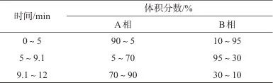 色譜柱:Alphasil VC-C18柱(100 mm×2.1 mm,2.5 μm,華譜科儀大連科技有限公司);柱溫:35 ℃;進(jìn)樣體積:5 μL;流動相:A相為2 mmol/L甲酸銨-0.01%甲酸水溶液,B相為甲醇溶液,流量為0.2 mL/min;;洗脫方式:梯度洗脫,洗脫程序見表1。