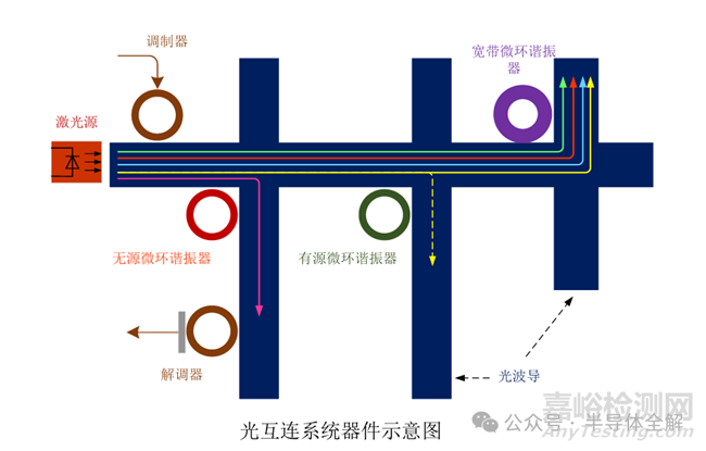 上圖是片上通信系統(tǒng)中使用了一些基本光學(xué)元件,包括激光源、調(diào)制器、解調(diào)器、微環(huán)諧振器和光波導(dǎo)。