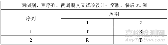 根據(jù)預(yù)BE試驗設(shè)計方案及結(jié)果,本品正式BE試驗采用兩制劑、兩序列、兩周期交叉試驗設(shè)計,空腹、餐后22例,采用平均生物等效性(ABE)進行評價。