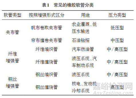 力,影響著實際工況中橡膠軟管的選擇。常見的橡膠軟管分類如表1所示。以核電站中常用的鋼絲纏繞液壓橡膠軟管為例,為適應核電站高壓工況下的介質輸送,增強層多選擇具備出色抗拉強度和耐壓性能的鋼絲纏繞層,層數(shù)為單層或雙層。