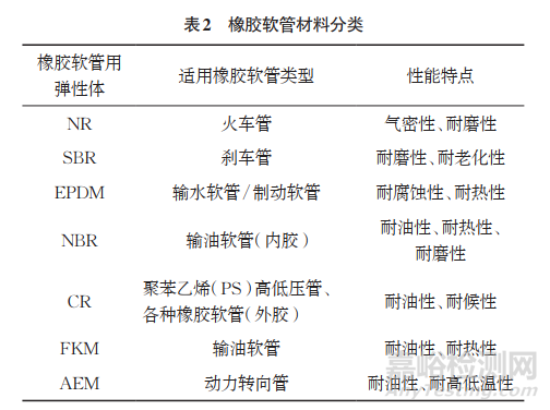 還可根據(jù)內、外覆層所用的材料對橡膠軟管進行分類,包括目前常用的天然橡膠(NR)、硫化橡膠(SBR)、三元乙丙橡膠(EPDM)、NBR、CR、氟橡膠(FKM)等一系列天然和合成橡膠,以及一些熱塑性彈性體,如乙烯-丙烯酸彈性體(AEM)和熱塑性聚氨酯(TPU)等。不同的橡膠材料具有不同的特點,以應用于不同領域,橡膠軟管材料分類如表2所示。