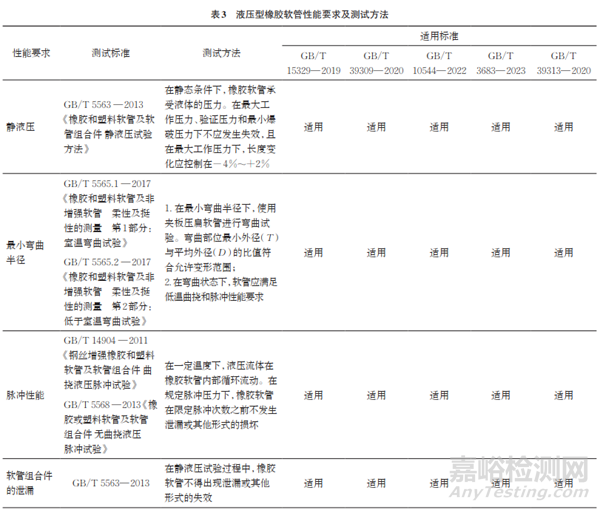 核電用橡膠軟管多是鋼絲或織物增強液壓型軟管。依據(jù)GB/T 15329—2019《橡膠軟管及軟管組合件 油基或水基流體適用的織物增強液壓型 規(guī)范》、GB/T 39309—2020《橡膠軟管和軟管組合件 液 壓用鋼絲或織物增強單一壓力型 規(guī)范》、GB/T 10544—2022《橡膠軟管及軟管組合件 油基或水基流體適用的鋼絲纏繞增強外覆橡膠液壓型 規(guī)范》、GB/T 3683—2023《橡膠軟管及軟管組合件 油 基或水基流體適用的鋼絲編織增強液壓型 規(guī)范》、GB/T 39313—2020《橡膠軟管及軟管組合件 輸送石油基或水基流體用致密鋼絲編織增強液壓型 規(guī)范》等相關標準,主要涉及靜液壓、脈沖性能、曲撓性能、層間黏合性能等多種性能要求(見表3)。其中,耐磨性僅在GB/T 3683—2023和GB/T 10544—2022 里提到,且在標準中并未闡明如何測試,僅規(guī)定“當有新的耐磨試驗方法可用時,應增加耐磨試驗要求”。經(jīng)查找確認,適用的試驗方法可參考GB/T 12721—2007《橡膠軟管 外覆層耐磨耗性能的測定》。事實上,這些性能要求不僅是橡膠軟管出廠時的關鍵檢驗指標,也為老化評估提供了重要的參考依據(jù)。