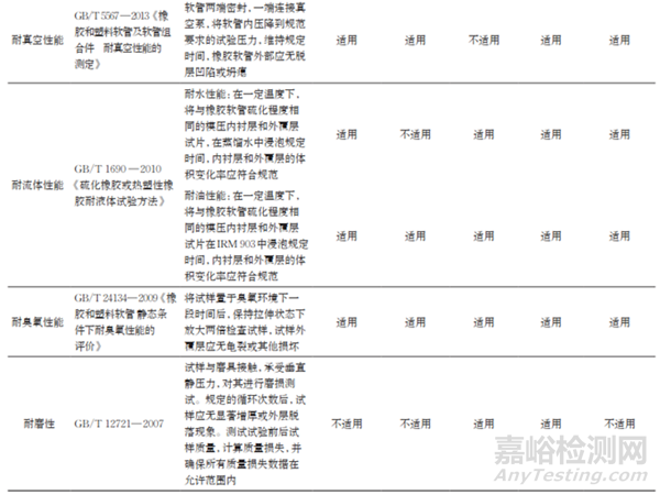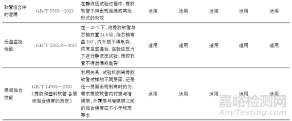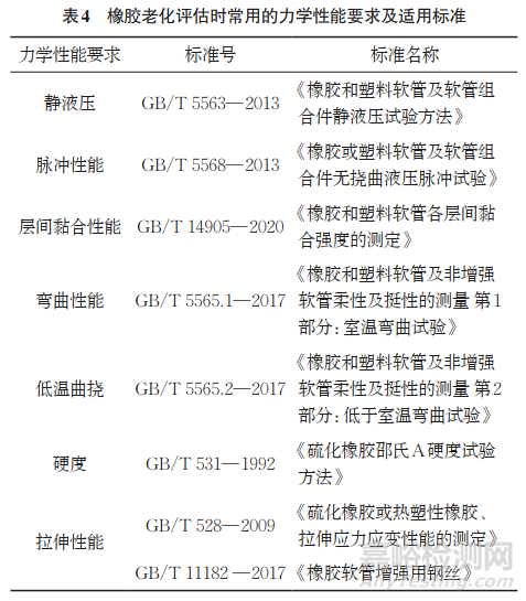 橡膠老化是由分子鏈的斷裂和新交聯(lián)反應引起的,這些變化會顯著改變其交聯(lián)網(wǎng)絡結構,導致橡膠材料在老化過程中力學性能發(fā)生顯著變化。因此,橡膠軟管及其橡膠材料的力學性能是評估其老化程度的重要指標。力學性能測試是通過對軟管施加各種機械載荷,模擬實際工況并觀察材料的劣化程度,如靜液壓、脈沖性能、層間黏合強度、拉伸性能、硬度、彎曲性能等。橡膠老化評估時常用的力學性能要求及適用標準如表4所示。