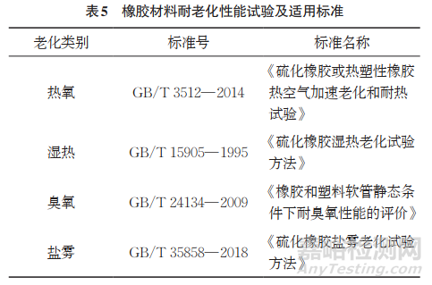 橡膠軟管長期暴露于極端環(huán)境時會發(fā)生物理和化學性質變化,從而影響其整體性能。因此,耐候性試驗主要評估橡膠軟管在長時間使用或暴露于惡劣環(huán)境下的耐久性和穩(wěn)定性。在開展針對核電用橡膠軟管的耐候性試驗時,應模擬多種核電站內的極端環(huán)境,測試橡膠軟管在這些條件下的性能變化,以確保橡膠在實際應用中的可靠性并預測其使用壽命。經(jīng)查閱,尚無針對橡膠軟管老化性能測試的專門標準。為系統(tǒng)評估橡膠軟管的耐候性能,以其主要材料橡膠為評估對象,總結了幾種常見核電環(huán)境中,橡膠材料的老化試驗方法及其應用標準(見表5)。