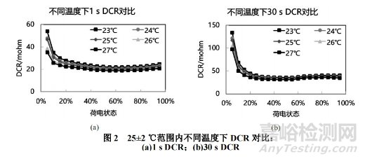 為提高直流內(nèi)阻(DCR)測(cè)試的準(zhǔn)確性和一致性,本文從現(xiàn)實(shí)及操作層面出發(fā),分別詳細(xì)討論了測(cè)試環(huán)境溫度、設(shè)備電流/電壓精度偏移、預(yù)處理或壽命測(cè)試過(guò)程中等待時(shí)間等因素在可控范圍內(nèi)波動(dòng)時(shí)對(duì)測(cè)試結(jié)果的影響: