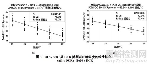 進(jìn)一步地,圖3以70%SOC處DCR為例,發(fā)現(xiàn)測(cè)試環(huán)境溫度處于25±2℃的范圍內(nèi),DCR與測(cè)試環(huán)境溫度呈明顯的負(fù)線性相關(guān),線性相關(guān)系數(shù)≥70%。