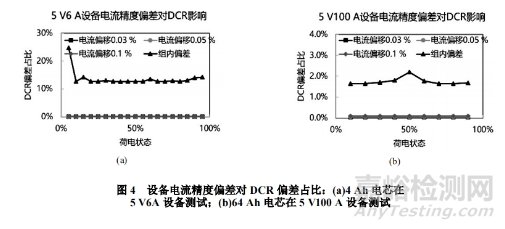 進(jìn)一步地,為有效評(píng)估設(shè)備長(zhǎng)期使用過(guò)程可能出現(xiàn)的精度偏移問(wèn)題,本文通過(guò)設(shè)備校準(zhǔn)補(bǔ)償,模擬對(duì)比Neware機(jī)電流/電壓精度在0.1%范圍內(nèi)偏移導(dǎo)致的DCR測(cè)試偏差,對(duì)設(shè)備的高低量程分別系列驗(yàn)證了設(shè)備電流/電壓精度對(duì)DCR測(cè)試結(jié)果的影響。