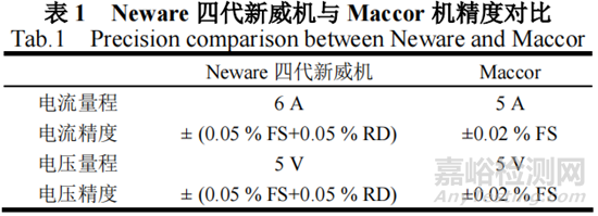 上述充放電機(jī)一般采用Neware四代新威機(jī)。在設(shè)備選型的影響因素驗(yàn)證中,同步與高精度設(shè)備Maccor機(jī)進(jìn)行不同溫度DCR測(cè)試的對(duì)比分析。實(shí)驗(yàn)選用32pcs相同設(shè)計(jì)的鋰離子電池依次在Neware和Maccor機(jī)上進(jìn)行相同流程的DCR測(cè)試。為減少電芯活化程度對(duì)測(cè)試的影響,兩種設(shè)備測(cè)試交替進(jìn)行,重復(fù)6次。Neware和Maccor機(jī)精度差異如表1所示。
