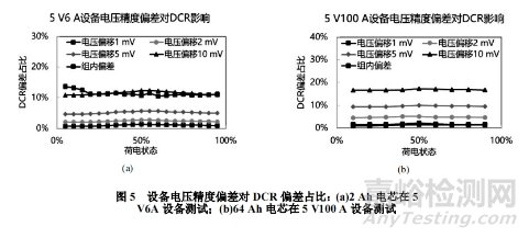 不同于電流精度偏移,電壓精度偏差對(duì)結(jié)果的影響卻更為明顯。對(duì)比圖5發(fā)現(xiàn),電壓偏移越大,DCR偏差占比越大。以DCR偏移小于實(shí)際測(cè)試電芯組內(nèi)偏差為判定依據(jù),則電芯容量在[0.3Ah,6Ah]范圍內(nèi),電壓偏移需≤5mV,而針對(duì)容量>6Ah的電芯,電壓偏移需≤1mV。