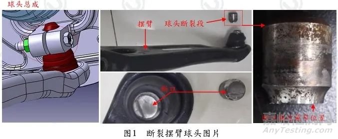 汽車前下擺臂球頭總成在路試車上斷裂,路試工況較惡劣,斷裂路段為鵝卵石路,斷裂公里數(shù)約6000公里。針對這種失效情況,客戶送檢斷裂擺臂球頭樣品進行測試分析,以期找出失效原因。