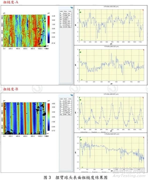 根據(jù)圖紙要求,球頭表面粗糙度管控為Ra1.6。實際測試結(jié)果顯示,側(cè)面位置 (A位置)面粗糙度為0.85μm,圓弧位置(B位置)面粗糙度為1.30μm,均符合圖紙設(shè)計。但考慮到裝夾異常,圓弧位置有可能產(chǎn)生應(yīng)力集中,進而成為薄弱環(huán)節(jié),建議適當管控。具體結(jié)果見圖3。