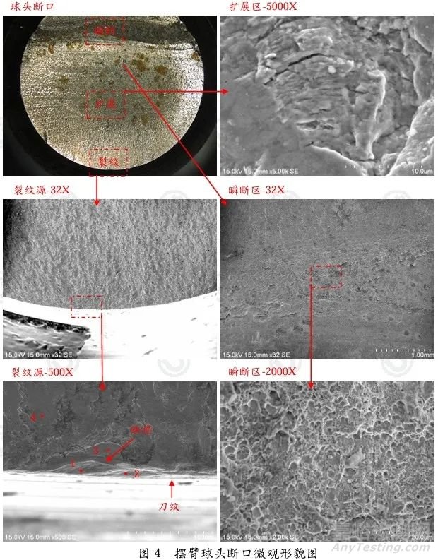 汽車前下擺臂球頭總成理想裝配時,易斷裂位置位于根部,但實際斷裂位置位于球頭圓弧底部。斷面擴展區(qū)面積差異較大,故推測球頭與固定側(cè)裝配不良(如上部裝配緊,下部裝配松),致使圓弧位置額外受力且受力不均,在外表面刀紋&缺損處引起應(yīng)力集中產(chǎn)生裂紋,在交變應(yīng)力作用下導(dǎo)致疲勞斷裂。