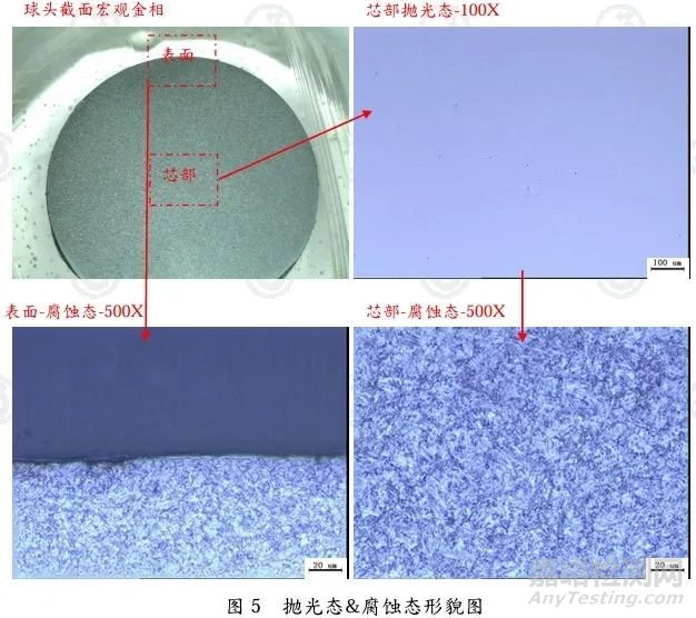 球頭截面宏觀金相顯示,材料均勻性較佳;球頭芯部拋光態(tài)顯示,材料無明顯氣孔與異常夾雜;表面與芯部組織均為保持馬氏體位相的回火索氏體,表面無脫碳等異常。具體形貌見圖5。