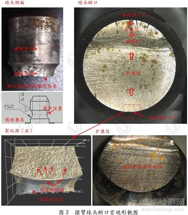 球頭側(cè)面存在一定腐蝕,圓弧位置可看到明顯的機加工刀紋,粗糙度結(jié)果見下頁;斷裂位置靠近圓弧最窄處,可觀察到對稱兩個裂紋源和擴展區(qū);擴展區(qū)面積差異較大,說明球頭受力不均,面積大的一側(cè)為主裂紋源,小的一側(cè)為次裂紋源,下面主要針對主裂紋源分析;裂紋源附近側(cè)面有明顯的刀紋&缺損,擴展區(qū)可觀察到貝殼紋,是典型的疲勞斷裂。具體宏觀形貌見圖2。