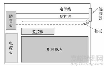 懷疑是模塊內(nèi)部電源線和監(jiān)控線的平行布線距離過(guò)長(zhǎng), 于是在模塊內(nèi)部更換布線方式? 更換布線方式后的設(shè)備內(nèi)部結(jié)構(gòu)示意圖如下圖所示: