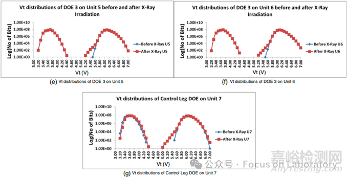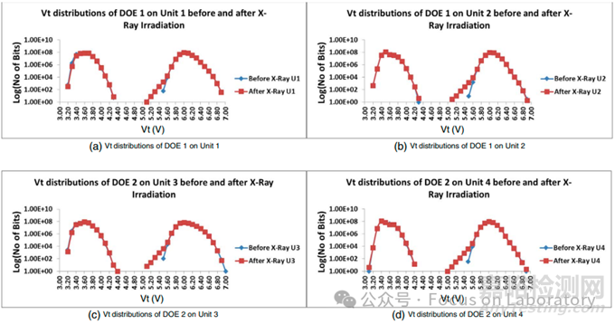 電荷丟失現(xiàn)象:X射線輻照導(dǎo)致部分存儲(chǔ)單元的閾值電壓(Vt)下降,特別是在編程分布的低端。