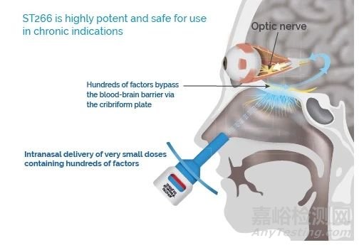 一種首創(chuàng)的多靶點非細胞平臺生物制劑,來源于對出生后廢棄的足月胎盤羊膜上皮細胞的培養(yǎng)。鼻內(nèi)給藥可使藥物通過篩板穿過血腦屏障。事實上,在臨床前研究中發(fā)現(xiàn),鼻內(nèi)給藥后,該藥物在視神經(jīng)組織中的濃度最高。在臨床前研究中,給小鼠使用 ST266 后,與安慰劑相比,它減少了視神經(jīng)炎癥和視網(wǎng)膜神經(jīng)節(jié)細胞的損失。研究表明, ST266 生物制劑通過釋放各種營養(yǎng)因子,在青光眼中發(fā)揮神經(jīng)保護作用。這些因子包括腦源性神經(jīng)營養(yǎng)因子、睫狀神經(jīng)營養(yǎng)因子和血小板衍生生長因子。該藥物已完成用于青光眼治療的 I 期臨床試驗,目前正在進一步研究中。雖然還需要更多研究,但 ST266 有望作為一種神經(jīng)保護療法,預防視網(wǎng)膜神經(jīng)節(jié)細胞(RGC)損傷和視神經(jīng)病變。