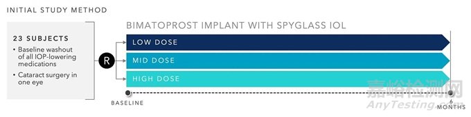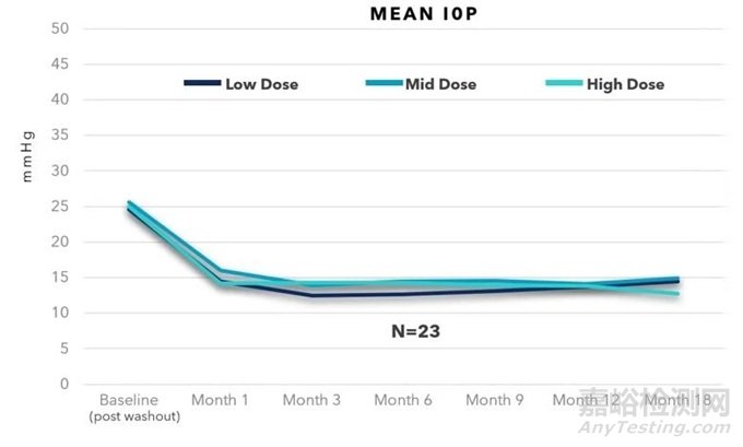SpyGlass 系統(tǒng)是一種單件式人工晶狀體(IOL),第一個也是唯一一個適用于所有白內(nèi)障外科醫(yī)生的藥物緩釋遞送平臺。在襻 - 光學部連接處附有兩個小的載藥墊,設(shè)計用于在常規(guī)白內(nèi)障手術(shù)中植入。對兔子進行的臨床前動物研究表明,即使在高達最大預期劑量 10 倍的劑量下,經(jīng)過 9 個月的評估,也未檢測到全身藥物暴露或不良反應。一項針對 23 名患有青光眼或高眼壓癥(OHT)患者的初步人體試驗顯示,所有劑量組在 3 個月后平均眼壓降低了 45%(見下圖)。目前已啟動一項隨機、多中心的 I/II 期臨床試驗,以進一步評估 SpyGlass 系統(tǒng)與標準人工晶狀體聯(lián)合局部青光眼藥物相比的安全性和有效性,2024年11月已完成患者招募。