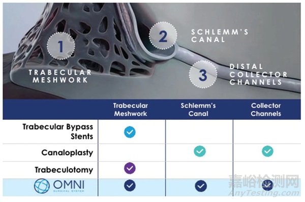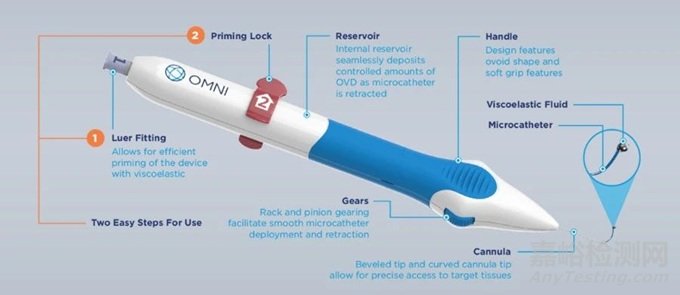 OMNI青光眼治療系統(tǒng)是一種手動操作裝置,用于輸送少量粘彈性流體,該系統(tǒng)將其兩種主要設備的獨特功能整合到一個設備中,只需一個設備和一次手術即可針對常規(guī)流出途徑中的三種阻力源(小梁網、Schlemm管和收集器通道)進行靶向輸出,為手術中切除術提供了安全性保障。該設備已獲得FDA認證以及歐盟CE認證。