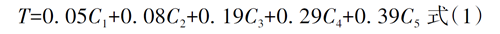 式中:T—涂層病害綜合評(píng)分;C1—變色病害等級(jí);C2—起泡病害等級(jí);C3—開裂病害等級(jí);C4—剝落病害等級(jí);C5—生銹病害等級(jí)。