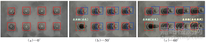 Fig.4 Matching situation between bolt detection frames and bolt reference frames in perspective-corrected inspection images from different shooting angles