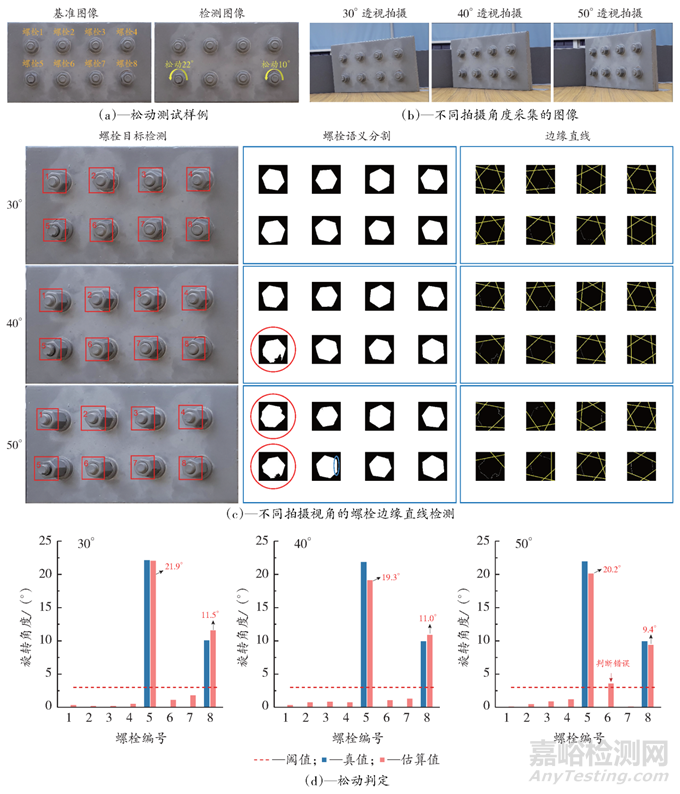 在視角為50°時(shí),由于螺栓6的輪廓受到嚴(yán)重透視變形的影響[圖5(d)],導(dǎo)致角度估計(jì)不準(zhǔn)確,被錯(cuò)誤地認(rèn)定為松動(dòng),對(duì)于其他沒有松動(dòng)的螺栓,所有旋轉(zhuǎn)角度未達(dá)到閾值。當(dāng)透視角度較大時(shí),還原實(shí)際螺栓輪廓的準(zhǔn)確性會(huì)減低,這可能導(dǎo)致錯(cuò)誤估計(jì)螺栓的松緊度。因此,我們建議將透視拍攝角度保持在≤40°,以減少此類誤差。經(jīng)過(guò)第三方機(jī)構(gòu)檢測(cè),本方法對(duì)于螺栓松動(dòng)的識(shí)別準(zhǔn)確率為99.7%