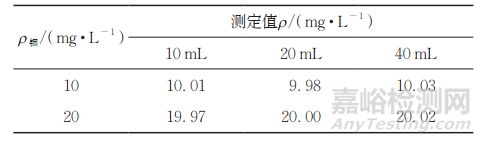 分別配制質(zhì)量濃度為10mg·L−1 和20mg·L−1的銦標準溶液,加入不同體積(10,20,40 mL)的體積比 1∶3的鹽酸 -硝酸混合溶液,按照儀器工作條件測定,結果見表3。
