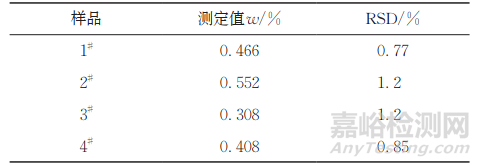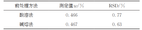 由表1可知,使用不同前處理方法得到的測定結果完全一致,且RSD都小,說明兩種方法的一致性和精密度較好,均能滿足分析的需要。