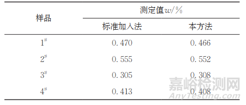 進一步通過F檢驗法來判斷兩種方法的精密度是否存在顯著性差異,計算F值為1.54,小于在置信度90%的情況下的F值(2.97),說明兩種方法的精密度沒有顯著性差異;用t檢驗法判斷兩種方法是否存在顯著性差異,計算t值為0.711,小于t0.10,20(1.72),說明兩種方法之間不存在顯著性差異。由于酸溶法所用試劑少、熔礦時間短、操作簡單、引入的鹽類基體小,因此試驗選擇體積比 1∶3的鹽酸-硝酸混合溶液的酸溶法進行前處理。