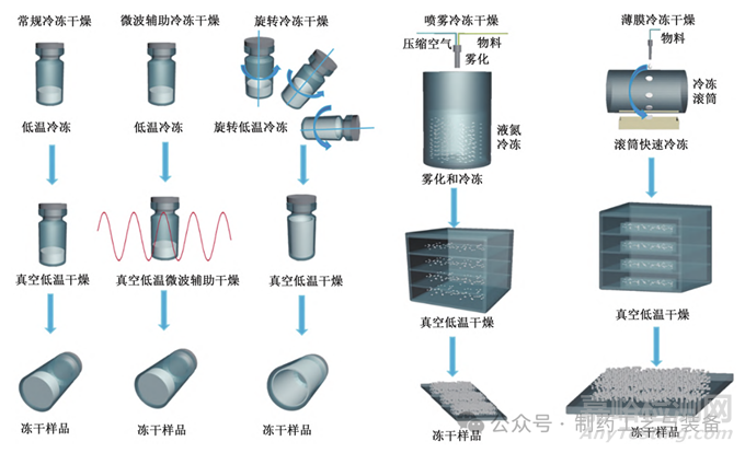凍干技術在疫苗等生物制品領域得到了廣泛應用。作為制造固體生物制品的主要手段,凍干具有許多優(yōu)勢。然而,凍干也存在著周期長、能耗高和資金投入大等問題。為了克服這些難題,研究人員進行了大量的探索,開發(fā)出許多創(chuàng)新的凍干技術。雖然有些技術尚未在無菌疫苗方面得到廣泛應用,但其中一些技術,如旋轉凍干、噴霧冷凍干燥、薄膜冷凍干燥和微波輔助冷凍干燥,進一步改善了向連續(xù)生產方式的轉變。這些創(chuàng)新的凍干技術有望提高生產效率、降低成本,并為疫苗的生產帶來更多的機遇。圖1展示了幾種冷凍干燥技術類型。