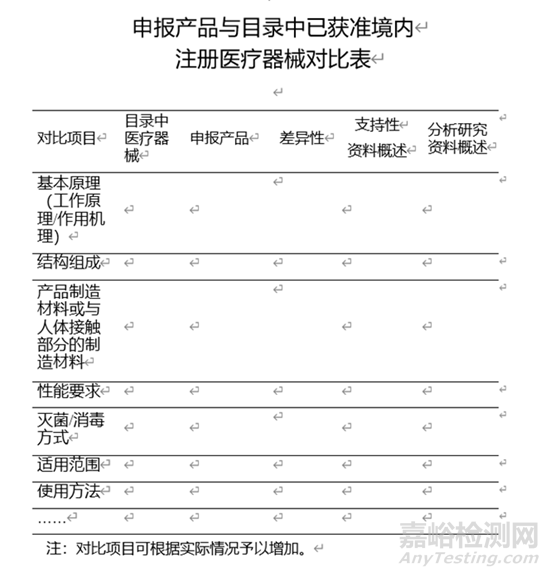 (二)提交申報產(chǎn)品與《目錄》中已獲準境內(nèi)注冊醫(yī)療器械的對比說明,對比說明應(yīng)當包括《申報產(chǎn)品與目錄中已獲準境內(nèi)注冊醫(yī)療器械對比表》(見附件)和相應(yīng)支持性資料。若經(jīng)對比,申報產(chǎn)品與對比產(chǎn)品存在差異,還應(yīng)提交差異部分對安全有效性影響的分析研究資料。二者的差異不應(yīng)引起不同的安全有效性問題,即申報產(chǎn)品未出現(xiàn)對比產(chǎn)品不存在的且可能引發(fā)重大風險和/或引起顯著影響有效性的問題。