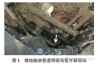 某城市埋地輸油管道材料為25號鋼,管道由無縫鋼管和沖壓彎頭焊接而成,設計壓力為0.6MPa,規(guī)格為273.1mm×7.1mm(長度×外徑),彎頭角度為90°,安裝條件為R=5D(R為管線彎曲部分安裝半徑,D為彎管直徑)。該彎管服役約10個月后,在焊接彎管處開裂并發(fā)生泄漏現象。