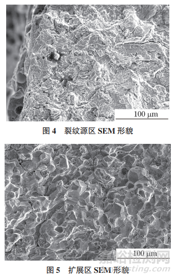 將裂紋打開后的斷口置于掃描電鏡下觀察,結果如圖4所示。在裂紋源處未見異常缺陷。圖5是擴展區(qū)SEM形貌,該區(qū)域微觀形貌特征以沿晶開裂為主。