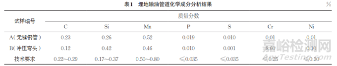 (1)該開裂埋地輸油管道由無縫鋼管和沖壓彎頭焊接而成,無縫鋼管材料符合25號鋼的國標要求,而沖壓彎頭材料鉻元素含量高達8.60%,屬于馬氏體不銹鋼,其焊接性能較差。