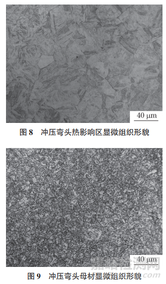 分別對焊縫區(qū)、沖壓彎頭熱影響區(qū)、母材區(qū)進行維氏硬度測試,沖壓彎頭熱影響區(qū)硬度達到424 HV0.5,遠大于母材區(qū)(198 HV0.5)和焊縫區(qū) (210 HV0.5),這是由于焊接彎管在焊接冷卻后生成脆而硬的馬氏體。