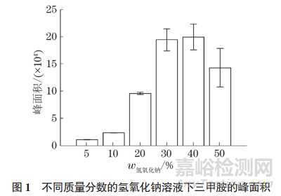 試驗進一步考察了不同質(zhì)量分數(shù)的氫氧化鈉溶液對5mg·L−1 三甲胺標準溶液中三甲胺峰面積的影響,如圖1所示。