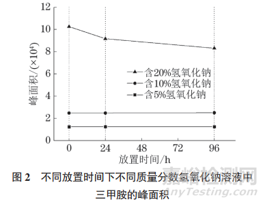存儲穩(wěn)定性也是影響結(jié)果準確度的重要指標,將含5%,10%,20%氫氧化鈉的5mg·L−1三甲胺標準溶液放置 24,96h后,三甲胺峰面積的變化情況見圖2。