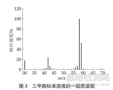 將三甲胺標準溶液恒溫孵化后注入氣相色譜-串聯(lián)質(zhì)譜儀,在m/z 30~70 內(nèi)進行一級質(zhì)譜全掃描,所得的質(zhì)譜圖如圖3所示。