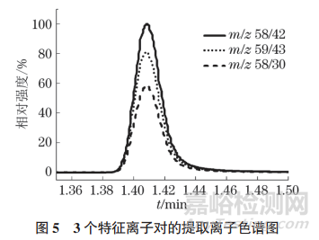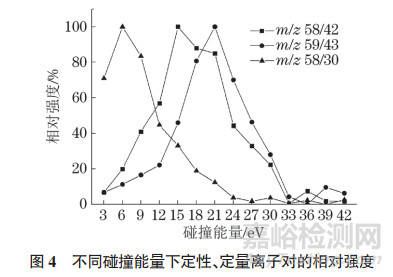 在扣除質(zhì)譜背景后,目標物在 m/z 58,59,42處出現(xiàn)特征碎片,這與 NIST標準質(zhì)譜數(shù)據(jù)庫和相關(guān)文獻報道相吻合,綜合考慮質(zhì)譜響應情況和抗干擾能力,選擇 m/z 58,59作為前體離子進行二級質(zhì)譜研究。根據(jù)結(jié)果將m/z 58/42作為定量離子對,另外一個m/z 58/30作為定性離子對;m/z 59的產(chǎn)物離子m/z 43響應較大,將m/z 59/43選作定性離子對。試驗進一步比較了上述 3個特征離子對在不同碰撞能量下的相對強度,結(jié)果如圖4所示。