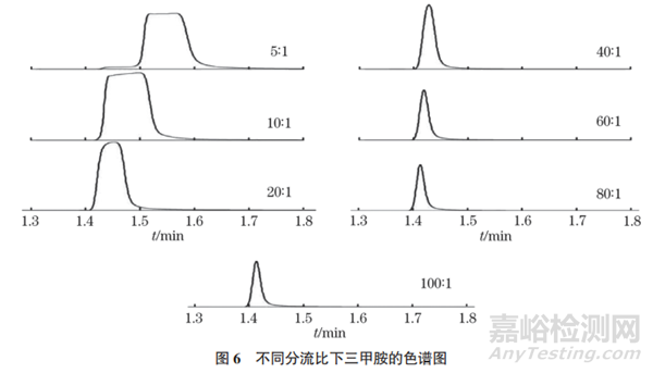 分流比是影響三甲胺峰形和分離度的關(guān)鍵因素,試驗考察了不同分流比對三甲胺出峰情況的影響,結(jié)果如圖6所示。