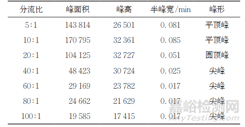 表1 不同分流比下三甲胺的色譜峰參數(shù)