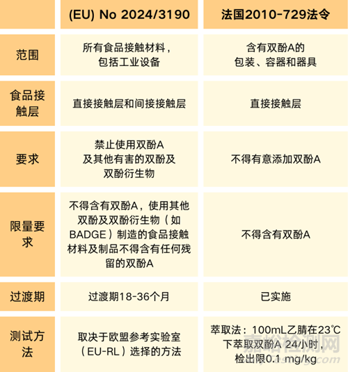 會(huì)議詳細(xì)對(duì)比了歐盟雙酚A禁令與法國(guó)現(xiàn)行2010-729食品包裝雙酚A禁令的兼容性,發(fā)現(xiàn)歐盟禁令的適用范圍更為廣泛,涵蓋所有食品接觸材料及工業(yè)設(shè)備,不僅禁止使用雙酚A,還擴(kuò)展至其他有害的雙酚及其衍生物。具體對(duì)比情況可以看下圖: