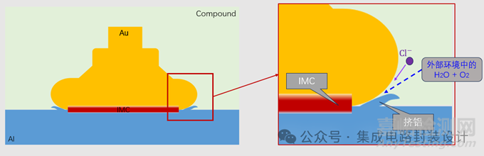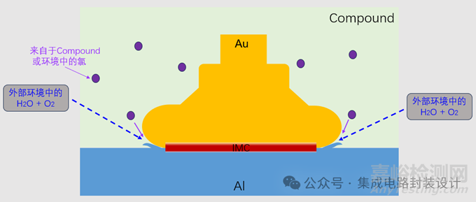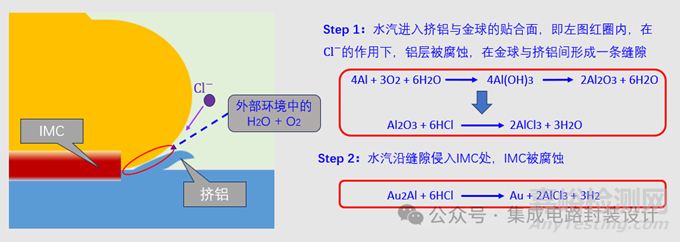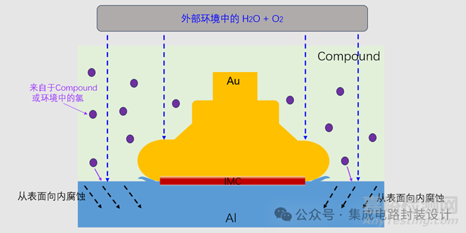 鋁焊盤表面暴露于潮濕的環(huán)境中發(fā)生腐蝕,并且會在氯的加持下加重并加速。其腐蝕路徑如下圖(以金、鋁鍵合為例):
