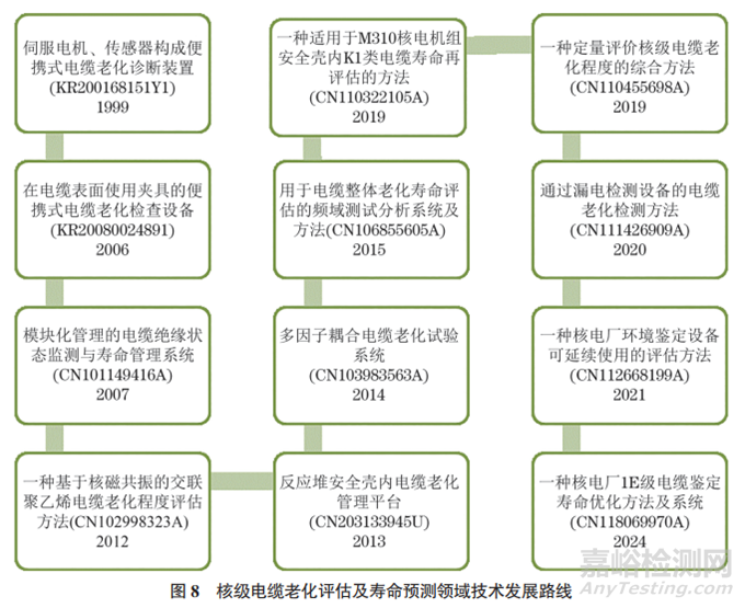 通過對申請日期、被引證頻次、同族專利情況以及技術(shù)內(nèi)容的綜合考慮,找到了技術(shù)發(fā)展各個(gè)時(shí)期代表性的專利技術(shù),通過對技術(shù)內(nèi)容的總結(jié)歸納,得到了核級電纜老化評估及壽命預(yù)測發(fā)展路線圖(見圖8)。
