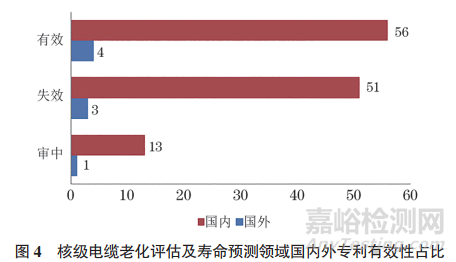 核級電纜老化評估及壽命預(yù)測領(lǐng)域國內(nèi)外專利有效性占比如圖4所示。由圖4可知:在總共128件專利申請中,我國國內(nèi)有效專利的數(shù)量達(dá)到56件,占比43.8%,在審專利申請的數(shù)量為13件,占比10.2%,已失效專利數(shù)量為51件,占比39.8%。國外有效專利的數(shù)量為4件,占比3.1%,在審專利申請的數(shù)量為1件,占比0.8%,已失效專利數(shù)量為3件,占比2.3%。其中,在審專利在不久之后有可能成為有效專利。從以上數(shù)據(jù)可以看出,在核級電纜老化評估及壽命預(yù)測領(lǐng)域,國內(nèi)外有效專利占比較高,同時(shí)還存在一定數(shù)量的、可能成為有效專利的在審案件,表明該領(lǐng)域仍處于技術(shù)增長和活躍的時(shí)期。
