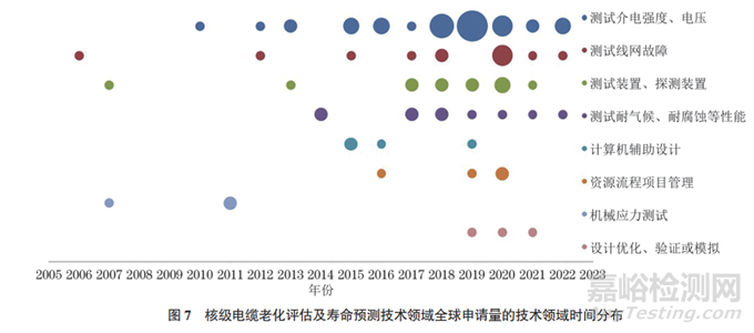 核級電纜老化評估及壽命預(yù)測技術(shù)領(lǐng)域全球申請量的技術(shù)領(lǐng)域時(shí)間分布如圖7所示。在圖7中,氣泡面積表示當(dāng)年申請量的多少。由圖7可知:在技術(shù)起步階段(1996—2005年),排名前8位的技術(shù)領(lǐng)域中尚沒有出現(xiàn)專利申請,電纜老化評估及壽命預(yù)測僅通過比較簡易的測試方法實(shí)現(xiàn)。例如,韓國電力公司在1999年提交的公開號為KR200168151Y1的專利申請公開了一種便攜式電纜老化診斷裝置,其主要是通過電機(jī)、夾具、傳感器等設(shè)備進(jìn)行組合,尚不涉及對電纜相關(guān)材料電磁、物化性能方面的全面測試。可以說這一時(shí)期尚未對核級電纜老化評估及壽命預(yù)測的主流技術(shù)領(lǐng)域展開研究工作。