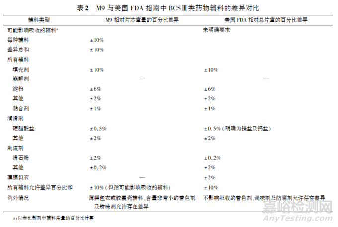對于BCSⅢ類藥物若滿足輔料方面的要求, 美國FDA指南允許輔料的等級存在差異。M9對于上述情況主要基于輔料的功能特性評估對產(chǎn)品性能的影響, 如果輔料的等級不同不影響產(chǎn)品的溶出等特性, 可以允許存在差異。NMPA指南中未對上述情況進行闡述。